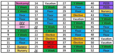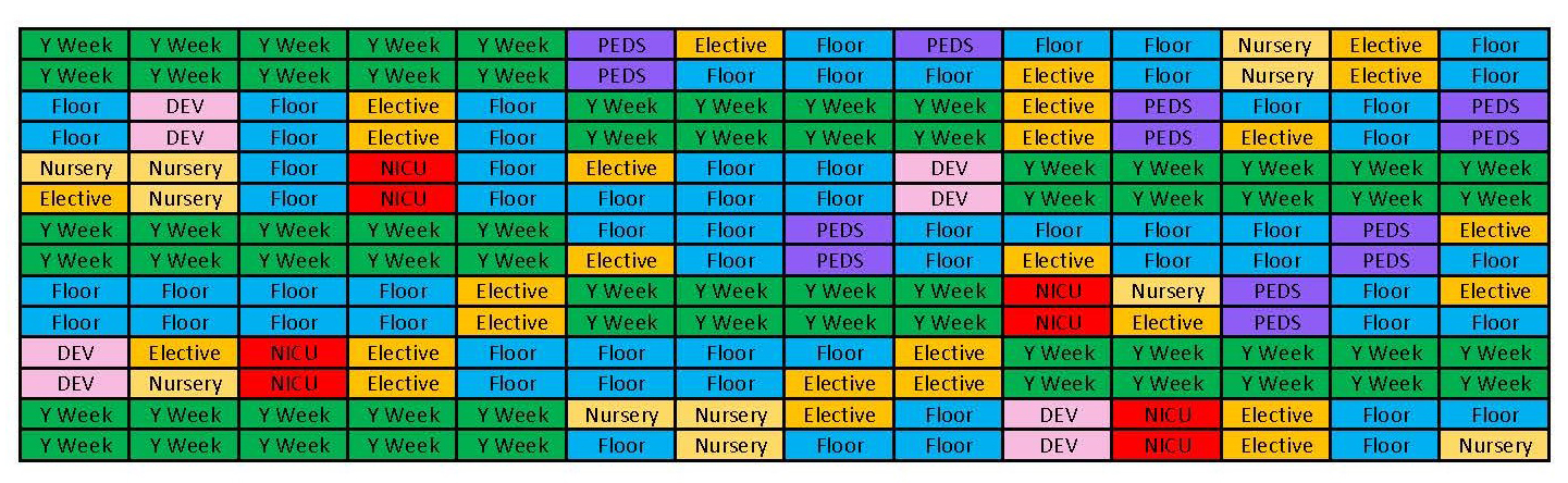 In our current model, the core inpatient rotations (general pediatric floor, ICU, electives) occur in the 2-4 week blocks and are followed by 2 "Y" weeks. During these "Y" weeks, residents have a mixture of their own primary continuity clinic, ambulatory elective time, other educational experiences and longitudinal curricula.